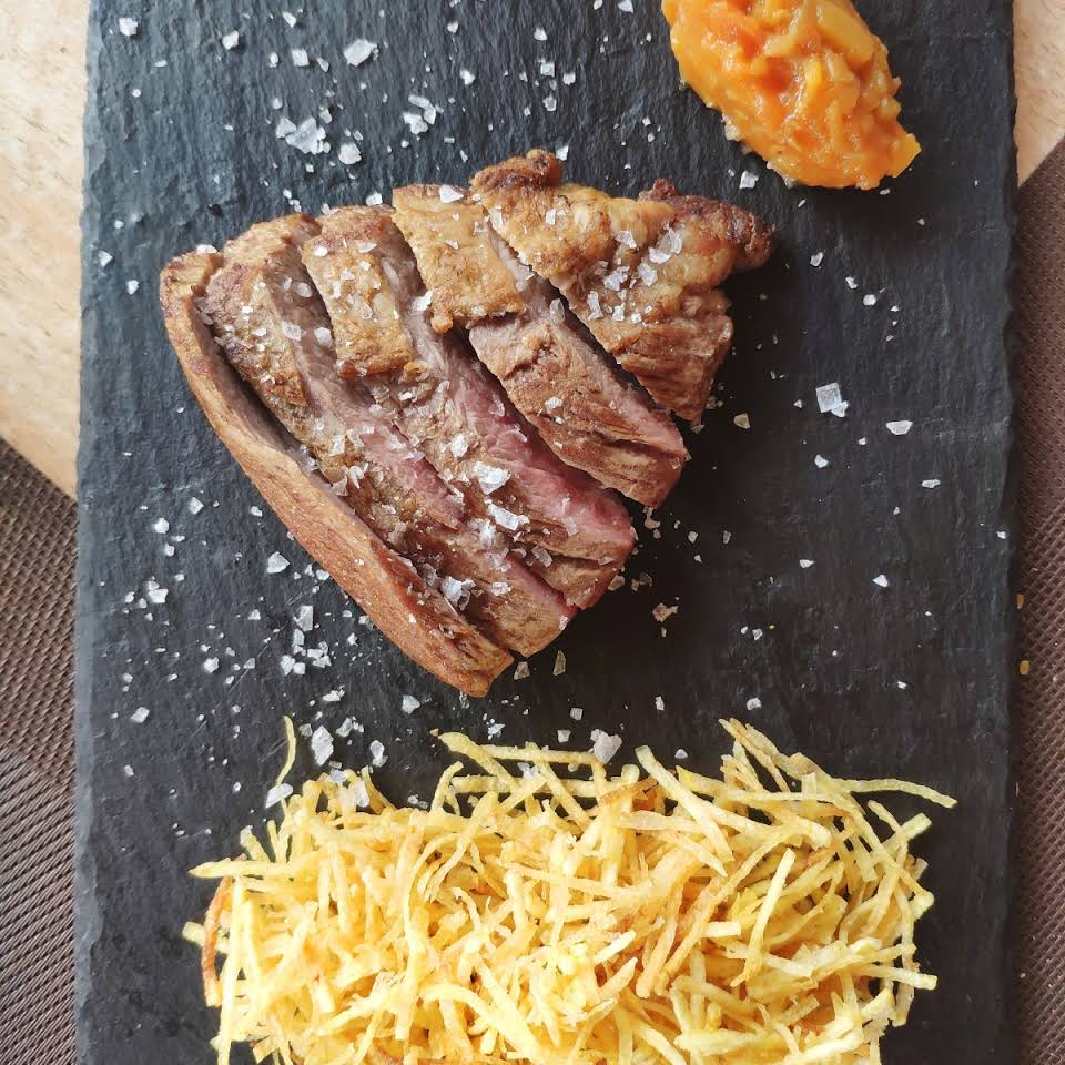 En cuanto a carnes, sus especialidades son el Magret de pato o el entrecotte de añojo, además de hacer asados en horno de leña por encargo. Y en cuanto a pescados, destacan la corvina salvaje con algas, el bacalao confitado o el pulpo a la brasa sobre parmentier. Todos ellos, acompañados una selección especial de blancos y tintos, como el Marqués de Vizhoja o el Martúe Especial 2014.