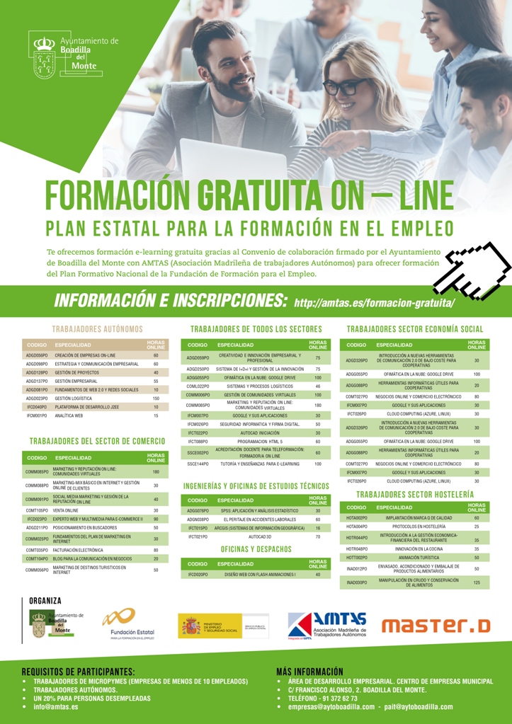 El Ayuntamiento de Boadilla del Monte ha suscrito un convenio con la Asociación Madrileña de Trabajadores Autónomos (AMTAS) por el que este colectivo, muy importante en el tejido económico municipal, podrá recibir formación ‘on line’ gratuita del Plan Formativo Nacional para el Empleo que se desarrollará durante el año 2018.