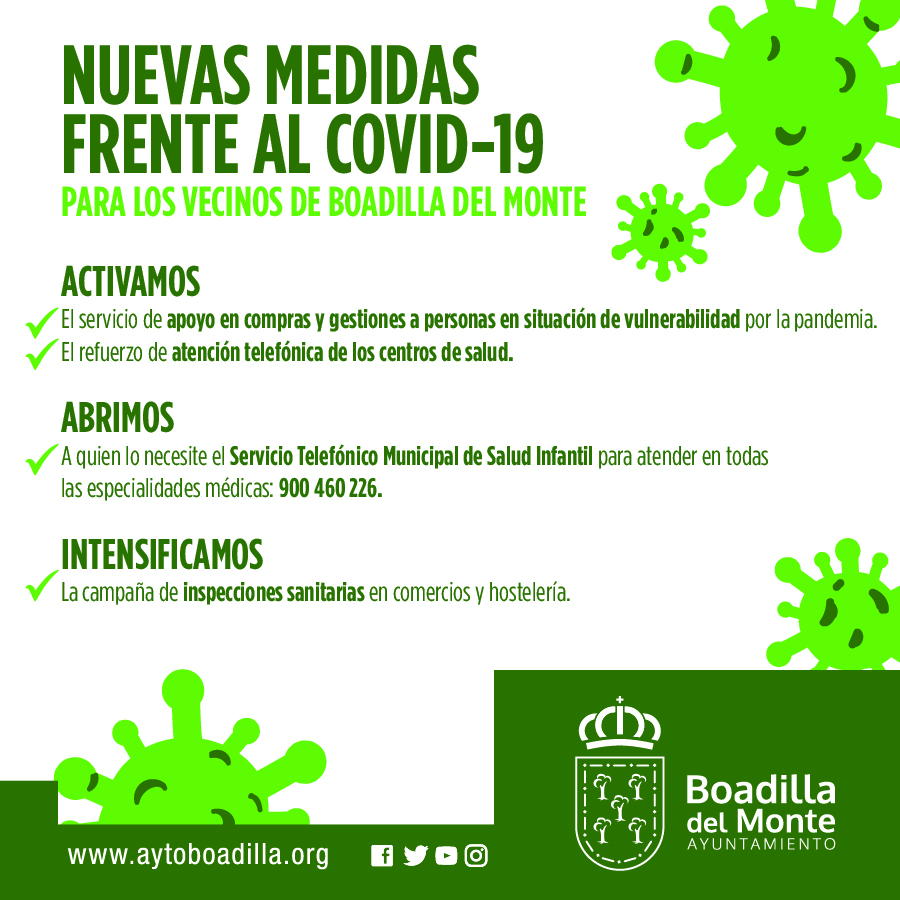 El Ayuntamiento de Boadilla del Monte ofrece diferentes servicios que se suman a las restricciones decretadas para frenar el ascenso de contagios por COVID-19, que ha situado la incidencia acumulada en los últimos 14 días en 795 casos por cada 100.000 habitantes.