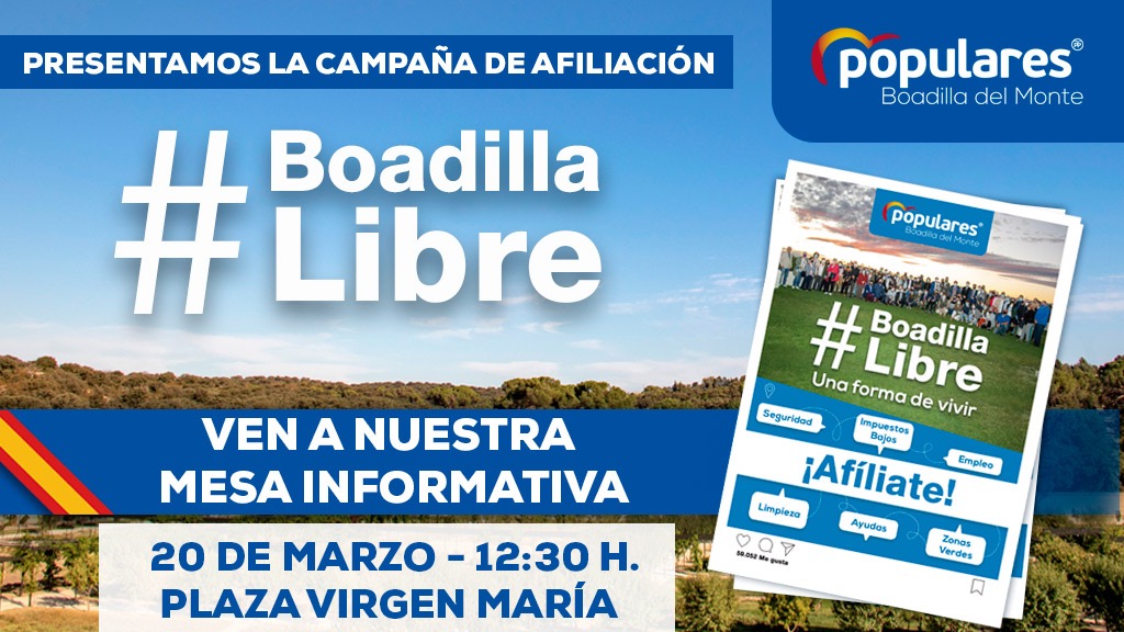 El grupo Popular de Boadilla del Monte comenzará este domingo la campaña de afiliación #BoadillaLibre, llamada así por la idea de transmitir a los vecinos el orgullo de vivir en el denominado “mejor municipio de España”.