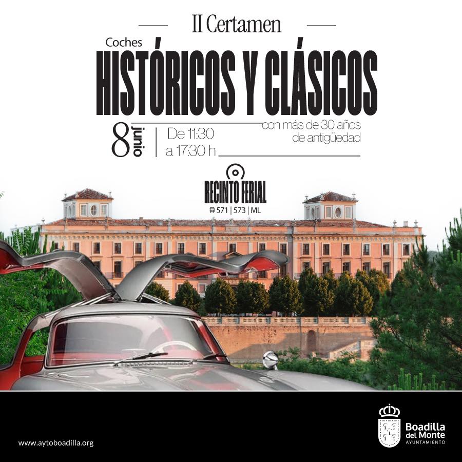 La segunda gran cita tendrá lugar el domingo 8 de junio, en el Recinto Ferial, con la celebración del II Certamen de Coches Históricos y Clásicos. Este evento estará abierto al público de 11:30 a 17:30 horas, y contará con una amplia exposición de automóviles con más de 30 años de antigüedad, incluyendo modelos míticos de marcas como Ferrari, Jaguar, Mercedes-Benz, Alfa Romeo, BMW, Lancia o Auto Unión.