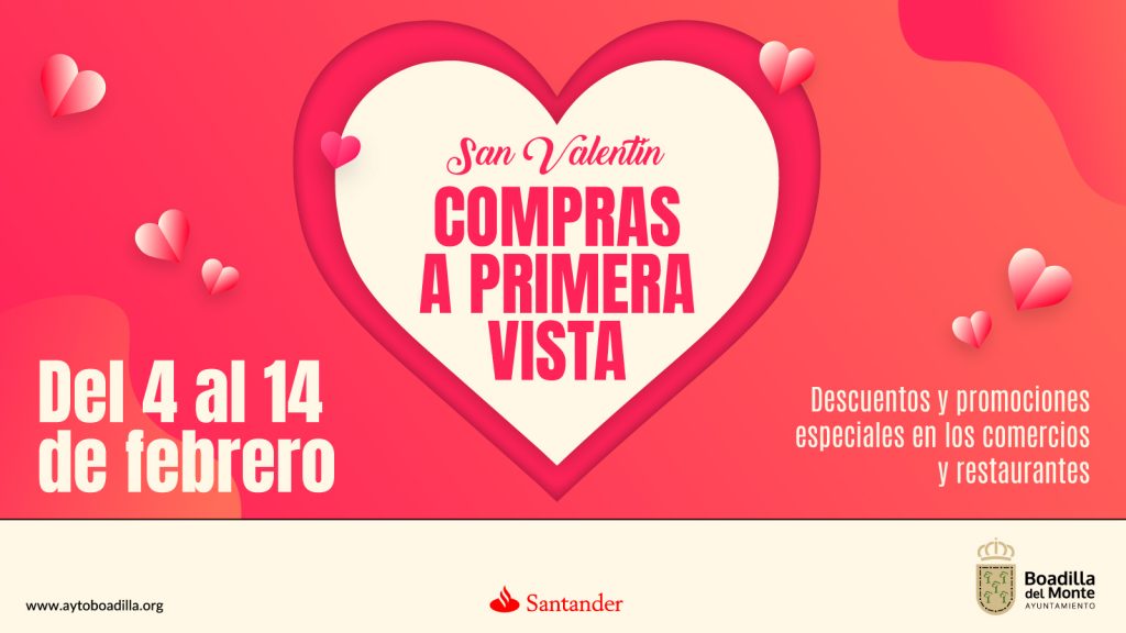 Entre los días 4 y 14 de febrero, 67 comercios, restaurantes y empresas de servicios de Boadilla ofrecerán descuentos y promociones, dentro de la campaña que el Ayuntamiento ha impulsado por el día de San Valentín, “Compras a primera vista”.