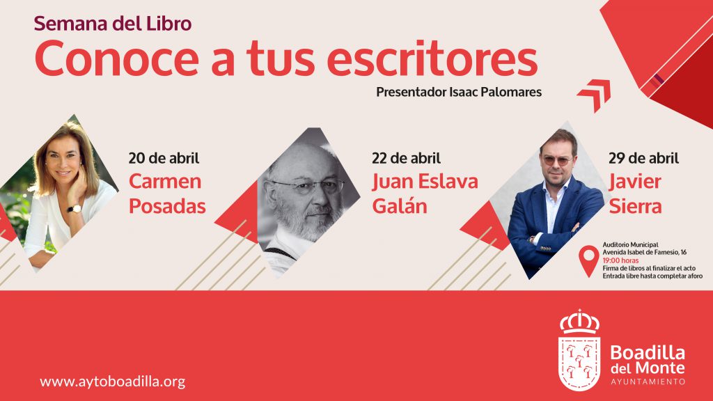 Boadilla del Monte celebrará la Semana del Libro con tres conferencias a cargo de escritores españoles de éxito.