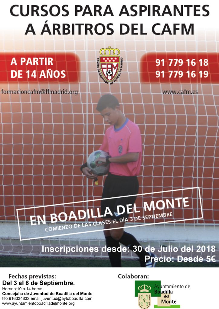 La Concejalía de Juventud y la Federación Madrileña de Fútbol han organizado un curso de Formación y Captación de Árbitros que se ofrecerá del 3 al 8 de septiembre, -entre las 10:00 y las 14:00 horas-, y en el que podrán participar jóvenes de entre 14 y 35 años. La inscripción puede hacerse en la propia Concejalía (Francisco Asenjo Barbieri, 2, Tf 91 633 48 32) hasta mediados de agosto. El curso tiene un coste simbólico de 5€ para los empadronados en Boadilla del Monte.