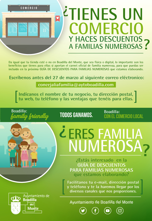 Para ello, hasta el próximo 27 de marzo los comercios interesados en aparecer en la guía con sus promociones y descuentos pueden escribir un correo a la dirección concejaliafamilia@aytoboadilla.com indicando el nombre del negocio, dirección postal, web, teléfono y ventajas que ofrece.
