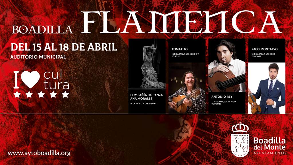 El Auditorio Municipal de Boadilla del Monte acogerá entre los días 15 y 18 de abril la segunda edición de su Festival de Flamenco. Con la participación de algunas de las figuras más destacadas del panorama musical español. Boadilla recupera así un festival que tuvo que ser suspendido el año pasado en estas mismas fechas debido al confinamiento domiciliario por la pandemia.
