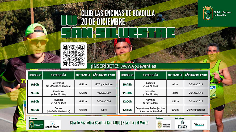 El próximo sábado 20 de diciembre se celebrará la IV San Silvestre organizada por el Club Las Encinas, a partir de las 9:30 horas, en sus instalaciones. La carrera se desarrollará en un circuito mixto y para varias categorías: