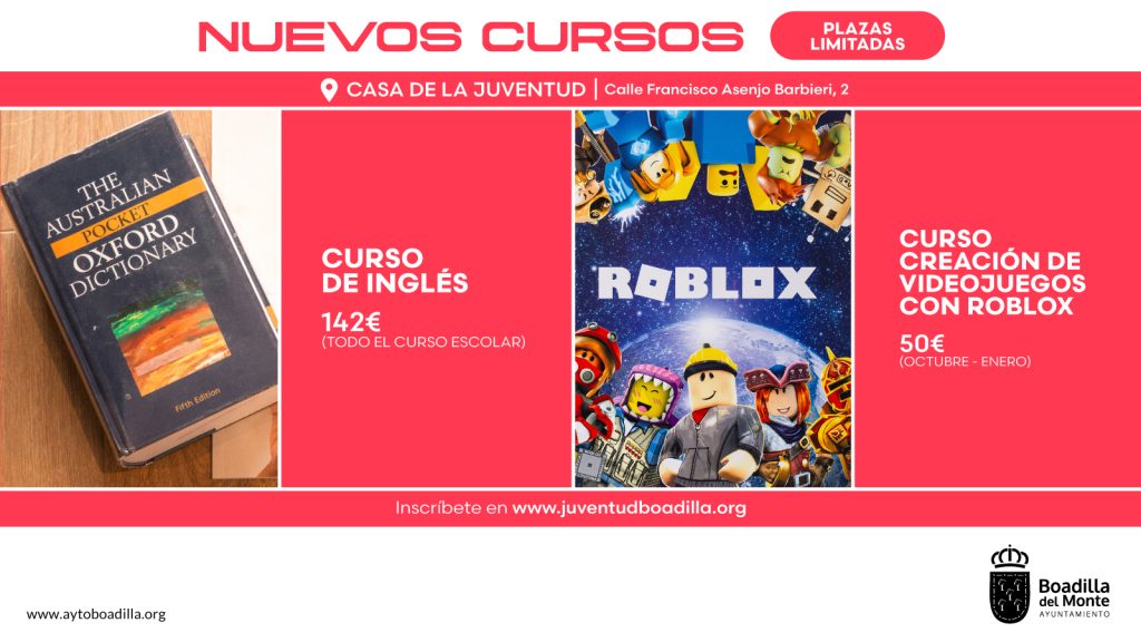 La Concejalía de Juventud del Ayuntamiento de Boadilla del Monte ofrecerá, entre el 5 de octubre y el 21 de diciembre, un curso de iniciación a Roblox, dirigido a alumnos de Primaria. Habrá un primer grupo para 3º y 4º, y un segundo para 5º y 6º.